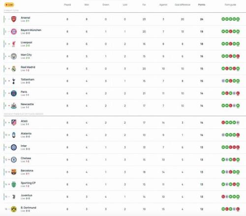 欧冠联赛阶段最后一轮18场同开,赛前6-13名的八支球队同积13分,对前八的直通名额展开了激烈争夺。不过半场过后,八支球队里仅曼城取得了领先。