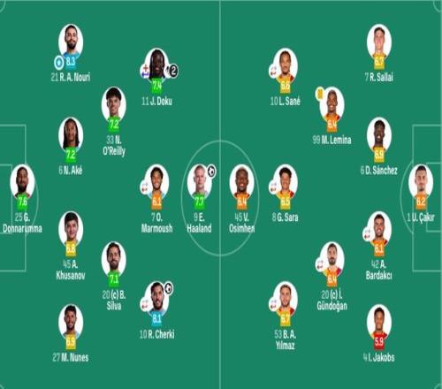 曼城出场阵容:25-多纳鲁马、6-阿克、21-努里、27-努内斯、45-胡桑诺夫、33-奥赖利、20-B席、10-谢尔基(82’14-尼科·冈萨雷斯)、7-马尔穆什(67’4-赖因德斯)、9-哈兰德、11-多库(37’47-福登)