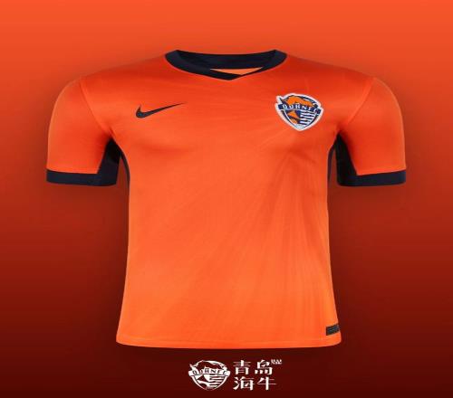 新赛季青岛海牛队主场球衣通过由队徽向外延展的光影纹样与橙、蓝配色,呈现球队的速度与活力。