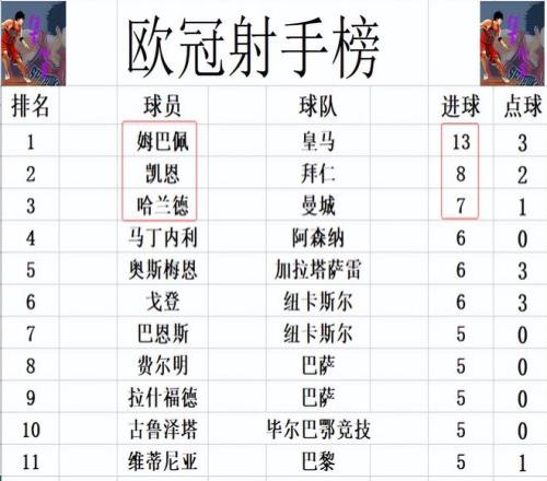 射手榜方面,皇马爆冷输球跌出前8,姆巴佩个人表现出色,今天梅开二度后,他离C罗17球的纪录是越来越近,13球继续稳居榜首,要是附加赛对阵本菲卡还能继续进球,姆巴佩还真有可能追上甚至打破C罗的纪录。凯恩今天打入一球8球还是排在第2,哈兰德7球紧随其后。拉什福德,维蒂尼亚追上费尔明,巴恩斯等人,将前十门槛提高到5球。
