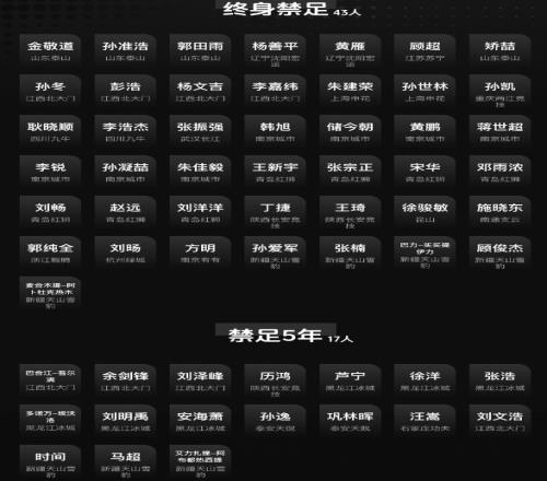 随后,足协首次公布处罚名单,包括金敬道、孙准浩、郭田雨、矫喆、朱建荣、孙士林在内的43人被终身禁足,包括汪嵩在内的17人被禁足5年。