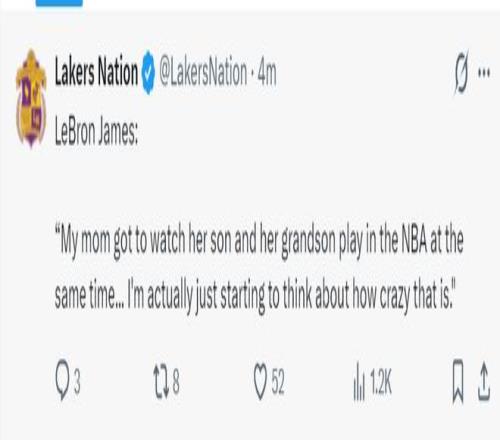 老詹继续说道:我妈妈能够同时见证自己的儿子、孙子在NBA打球,我其实刚刚在看视频时思考这有多么的不可思议。