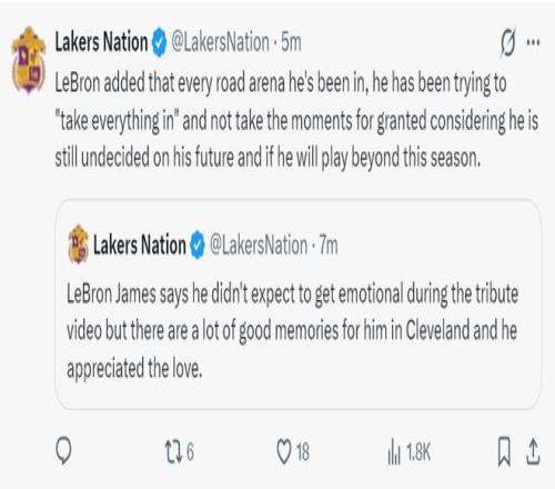 詹皇感激骑士致敬之爱:不确定明年还会征战!铁林分析大概率退役