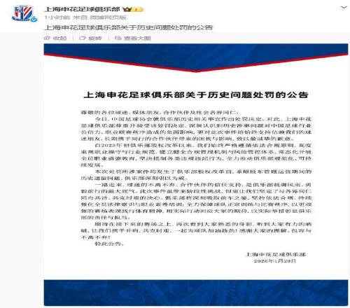 1月29日上午,国家体育总局、公安部、中国足协联合召开征途国际 发布会,介绍足球行业“假赌黑”问题专项整治行动的相关情况,13家俱乐部被罚。其中,上海申花足球俱乐部,扣10分并罚款100万元;上海海港足球俱乐部,扣5分并罚款40万元。当天,上海两家足球俱乐部发文致歉。