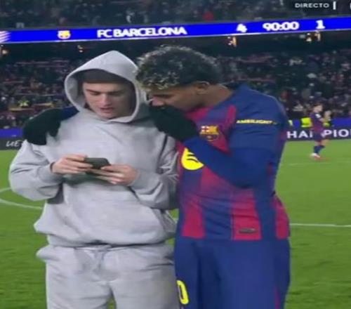 镜头捕捉到有趣一幕:因伤缺阵的加维赛后跑进球场,向亚马尔展示手机内容,两人随即开怀大笑。外界普遍认为,他展示的正是皇马在里斯本2-4不敌本菲卡的战报。