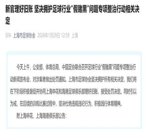 1 月 29 日上午,国家体育总局、公安部、中国足协联合召开征途国际 发布会,介绍足球行业 “假赌黑” 问题专项整治行动的相关情况,13 家俱乐部被罚。其中,两支申城中超球队都收到处罚决定:上海申花被扣 10 分并罚款 100 万元,上海海港足球俱乐部被扣 5 分并罚款 40 万元。