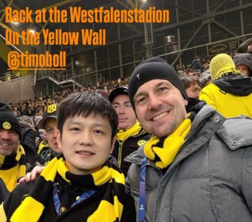 樊振东在社媒发文道:“外面暴雪纷飞,内心燃着黄黑火焰 。重返西格纳伊度纳公园球场,站在‘黄墙’看台之上。这是一个艰难的夜晚。看着多特蒙德和皇马双双输球,心里真的很难受。”