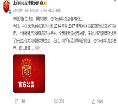 被扣5分+罚款!处罚结果出来后,中超卫冕冠军上海海港足球俱乐部第一时间在官微上发布公告(下图)。文中表示俱乐部在初创阶段的管理环节上存在失当、失控,对行业规则敬畏不足等问题,并许诺以后会深刻地以此为戒。俱乐部的致歉引起大量海港球迷的共鸣,大家纷纷在评论区留言表达了理解和支持,表示征途国际 清清白白,四个中超冠军干干净净。