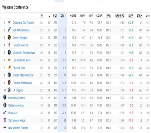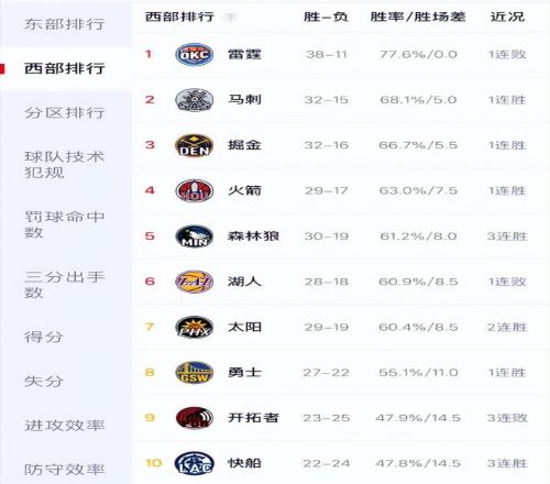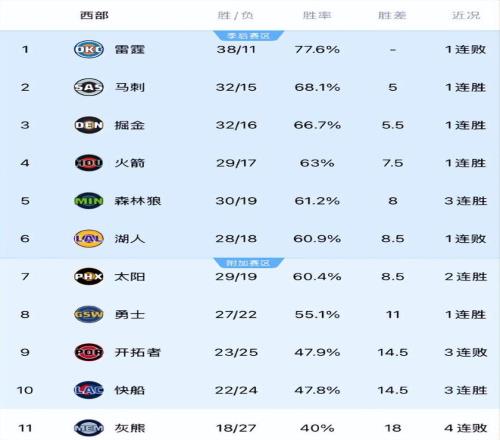 西部排名更新!森林狼爆冷雷霆反超湖人升第五太阳连胜稳压勇士