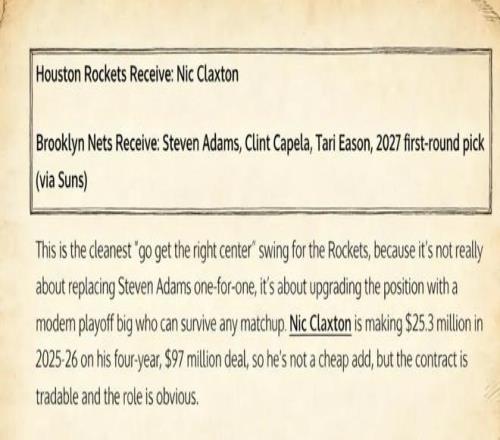 4换1!炸裂交易方案出炉,场均12+7神塔驰援火箭,顶替亚当斯