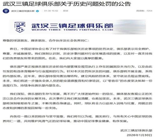 今天下午,武汉三镇在俱乐部官方社交账号上发布公告,称完全拥护、尊重并诚恳接受中国足协的处罚决定,深刻认识到历史涉事问题对行业环境造成的损害,并致以真挚的歉意。