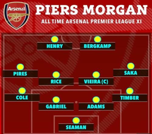 根据《太阳报》的最新报道,皮尔斯-摩根评选的阿森纳英超历史最佳阵容引发了不小争议。作为知名的阿森纳死忠,摩根认为,除了一众俱乐部传奇外,现役阵容中有四名球员足以入选这份名单。