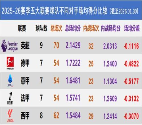 这也侧面证明了“五大联赛”果然不是白叫的,因为各大联赛的场均得分都出现了不同程度的下滑,说明比起其他中小联赛的对手,五大联赛球队还是不太好踢的。