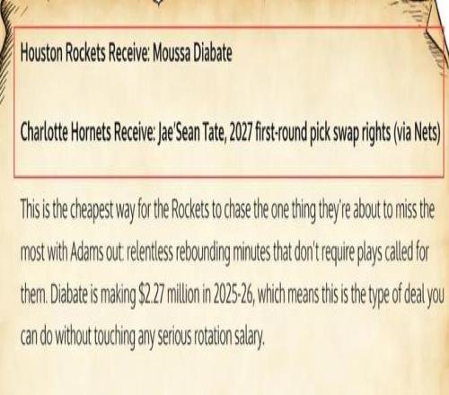 在球队管理层迟迟没有动静的情况下,一些媒体、球迷纷纷开始为他们出谋划策。比如,美媒《Fadeaway World》便撰文建议,火箭可以将泰特以及2027年首轮签的互换权(来自篮网)送到黄蜂,换回迪亚巴特。