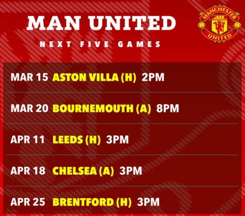 3月20日对阵伯恩茅斯的比赛后,国际比赛日将会到来,曼联到下一场比赛对阵利兹联之间,有长达24天的等待时间,这场「玫瑰德比」被推迟了两天,到4月13日才举行。