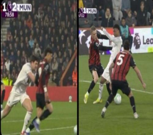 两次拉人,两种判罚。 曼联本该获得第二个点球的机会变成对手反击进球,而伯恩茅斯则用一次相似的动作直接导致曼联十人应战并丢掉领先优势。