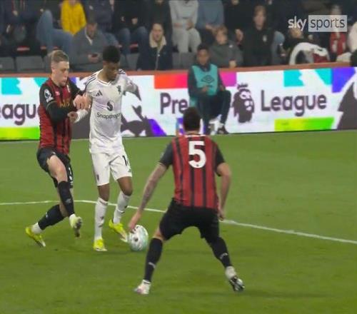 当时,1-0领先的曼联攻入伯恩茅斯禁区,布鲁诺·费尔南德斯妙传阿马德·迪亚洛,后者顺势带入禁区,在阿德里安·特鲁弗尔又拉又推之下倒地了。主裁斯图尔特·阿特维尔没有吹犯规,伯恩茅斯得球反击,并且取得进球。