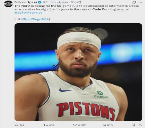 活塞球星坎宁安遭遇气胸,赛季至今他只打了61场常规赛,如果常规赛报销的话,他将失去最佳阵容等奖项的评选。坎宁安的经纪人专门就此事发表声明:“坎宁安打出了最佳一阵级别的表现,不应该因伤病被剥夺获奖的权利。”