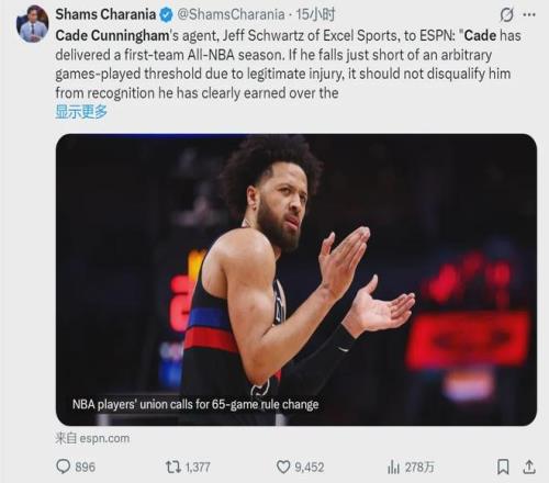 经纪人为自己的客户打抱不平,也在情理之中。值得一提的是,NBA球员工会发言人也为坎宁安发声,呼吁废除65场评奖条件:“自该规则实施以来,已有太多当之无愧的球员因这一武断的场次要求,被不公正地剥夺荣誉的评选资格。”