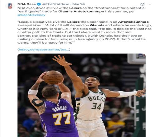 3月24日肖恩-迪瓦尼的详细报道为:联盟高管认为在扬尼斯的争夺战中湖人处于领导地位。这很大程度取决于扬尼斯本人与他的团体想去洛杉矶还是纽约。