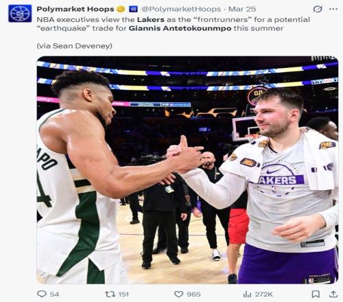 一位匿名的高管透露,如果扬尼斯留在东部进入总决赛的道路会更平坦,但湖人希望推动这笔重磅交易,让两位欧洲巨星齐聚洛杉矶。当然,湖人也有可能将这笔引援留到2027年夏,那时候湖人可以直接签下扬尼斯而非交易。