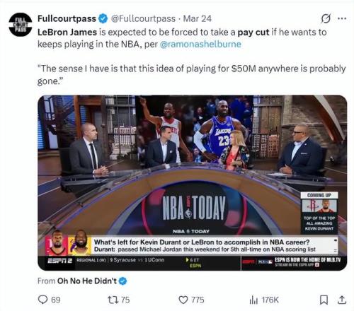 3月24日,ESPN记者蕾梦娜-谢尔伯恩透露,詹姆斯拿5000万年薪的时代已经过去了,勒布朗也愿意在今夏降薪,以此来帮助湖人续约奥斯汀-里夫斯与补强阵容。(但她没有说勒布朗会接受多大的降薪幅度,这一切都需要佩林卡去谈)
