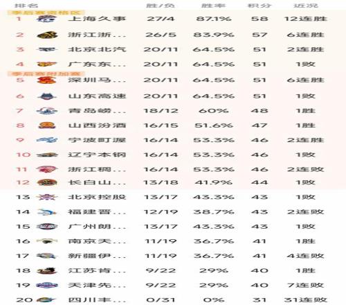 随着上海12连胜,广东被三分绝杀,CBA最新排名出炉!广厦排第2