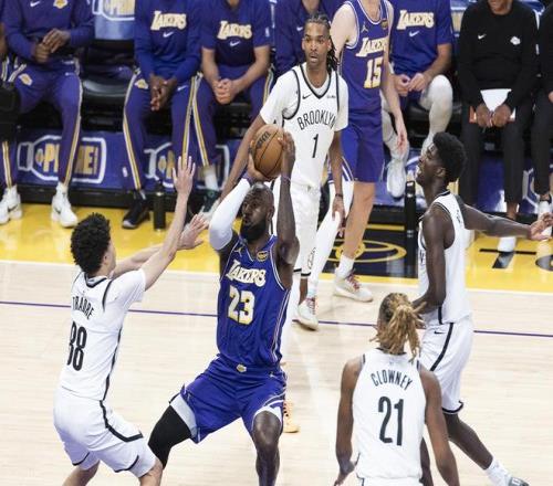 第二节双方轮换阵容阶段,篮网上来一波小高潮追到只差1分,湖人暂停。但暂停以后,篮网内外开花领先到5分,詹姆斯助攻布朗尼三分命中止血,然后自己造犯规两罚两中。东契奇三分命中湖人重新领先,然后抛投再进领先到了7分。但特拉奥雷突然爆发,连得4分帮助篮网紧紧咬住比分,半场结束之前他又命中压哨三分,湖人61-59只领先2分。