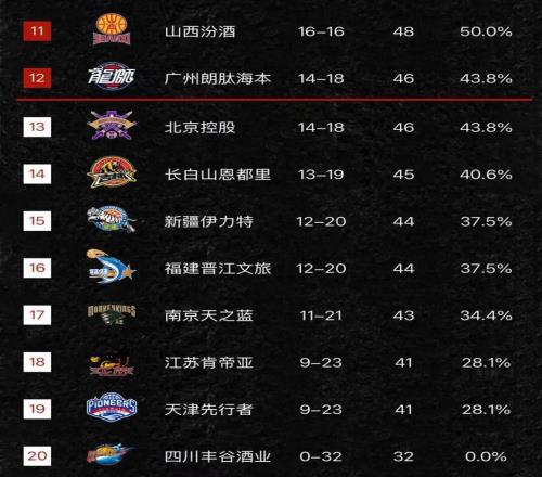 山西队掉至了第十一名的位置,广州则是继续稳住季后赛队伍排在第十二名,北控和广州一样的战绩排在第十三名,吉林队十四名,新疆队再度输球到了第十五名的位置,福建队和新疆队一样的积分排在第十六名,南京队排在第十七名,江苏队排在第十八名,天津队排在第十九名,四川队本赛季未尝一胜排在第二十名!