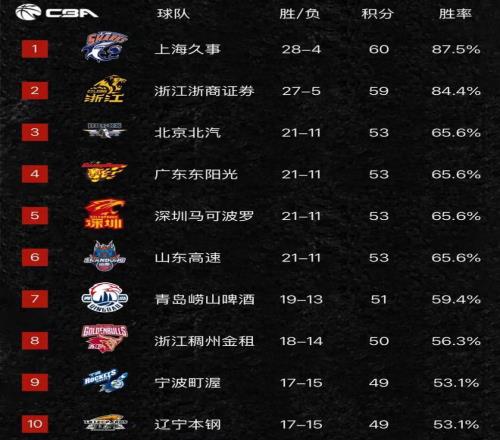 随着上海队力克山西,广东大胜四川,辽宁拿下福建,CBA排名重新排名,辽宁回到第十