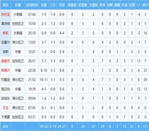 本场比赛,山东队共4人得分上双,斯蒂尔10投8中,其中三分球3投全中,斩获27分5篮板。约翰逊不遑多让,11投10中,贡献26分4篮板7助攻。国内双塔陶汉林和郭凯同样表现不俗,陶汉林13分4篮板,郭凯16分5篮板。