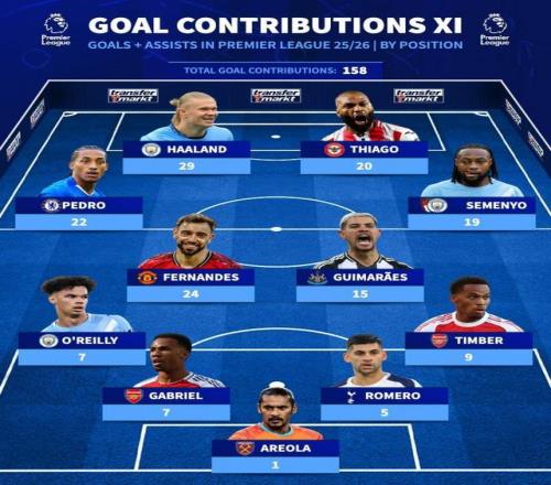 德国转会市场盘点了本赛季英超球员联赛参与进球最多阵,前场四重奏哈兰德、伊戈尔·蒂亚戈、若昂·佩德罗以及塞梅尼奥,B费、吉马良斯在列。