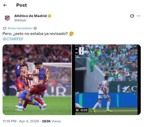 赛后,马竞官方账号晒出了西甲此前的判罚案例,公开质疑当值主裁。马竞在官方社媒上,将本场马丁未被罚下的情况,与本赛季西甲第25轮贝蒂斯对阵巴列卡诺一役中的一次类似判罚进行对比。