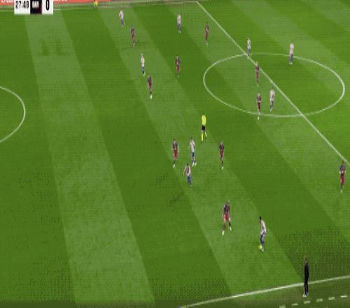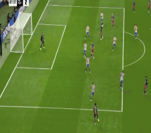 第28分钟,马竞的传球简洁明了,巴埃纳传中,面对绝佳机会,格列兹曼将球打高。