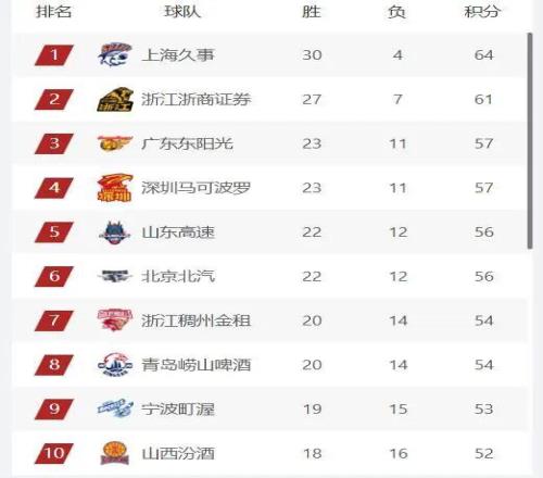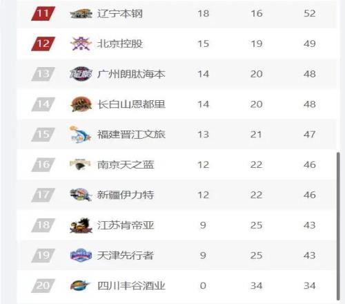 CBA最新排名,广东第3,深圳第4,辽宁跌至第11位