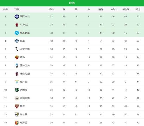随着国米52双杀罗马+都灵10!意甲最新积分榜:26名差8分