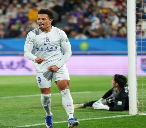 4月5日,上海申花队球员拉唐(左)在比赛中命中点球后庆祝。新华社记者 孙凡越 摄