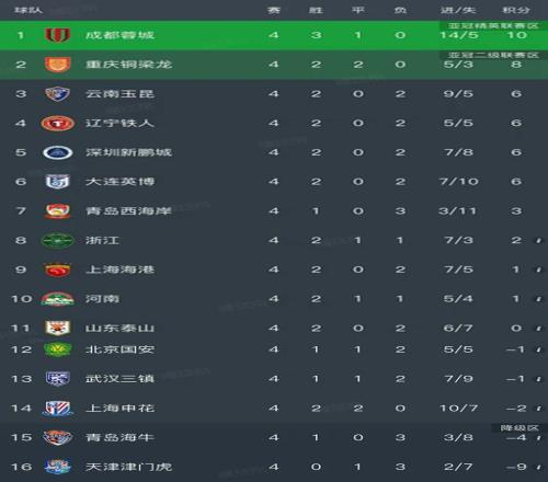 北京时间4月5日,今日的中超第4轮结束了最后三场比赛,征途国际 看看最新的排名,主要的战况是:申花3-2绝杀天津津门虎,重庆铜梁龙1-0小胜浙江队,深圳新鹏城5-2大胜武汉三镇!