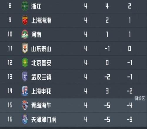 中超第4轮战罢,本轮结束后,中超9支负分球队仍处后9位。本轮上海海港取胜将积分转正,国安、三镇、申花、海牛和津门虎暂未抹去负分。