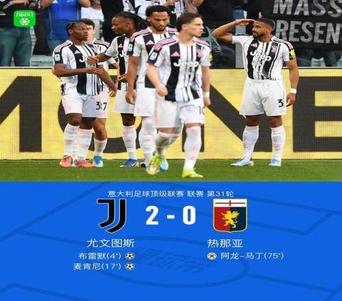北京时间4月7日00:00,意甲第31轮,尤文图斯主场对阵热那亚。上半场,布雷默头球破门,随后孔塞桑助攻麦肯尼推射扩大比分,半场结束前,麦肯尼近距离打门将球踢高错失良机。下半场,乔纳森-戴维抽射击中立柱,布雷默禁区内送点,下半时替补登场的迪格雷戈里奥将阿龙-马丁的点球扑出,最终,尤文2-0战胜热那亚,距离欧冠区1分。