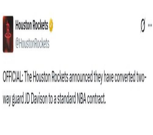 火箭官宣转正戴维森!敲定季后赛15人名单杜兰特申京率队冲冠