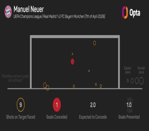 自从Opta开始进行详细数据统计以来,诺伊尔是第一位在伯纳乌球场对阵皇家马德里的欧冠淘汰赛中完成9次扑救的门将。
