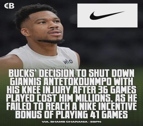 北京时间4月8日,NBA名记Shams撰写了一篇关于密尔沃基雄鹿队内幕的深度报道。雄鹿早就无缘附加赛,但字母哥强烈要求复出,大家一开始不知道为什么!Shams透露,因为耐克给字母哥的合同有个要求:单赛季出战超过41场。