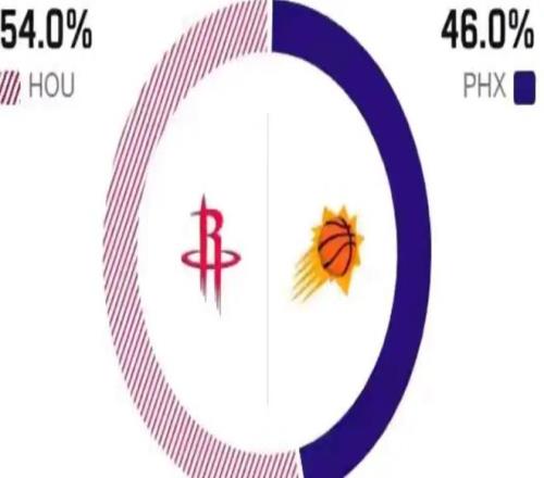 反观太阳,在上一场比赛击败公牛,终结2连败,以43胜35负排在西部第七。对阵公牛一战,球队调整首发,将吉莱斯皮放回替补带队第二阵容效果显著,布克30分、格林25分表现高效;狄龙复出后出场时间稳步提升,砍下15分,马文·威廉姆斯14分8篮板。目前太阳与前后对手均有3个胜场差,基本锁定第七,后续球队在保证全员健康的前提下,大概率以练兵为主兼顾争胜,所以,太阳的战意并不如火箭足。赛前,ESPN预测本场比赛的结果,火箭胜率为54%,太阳取胜概率为46%。