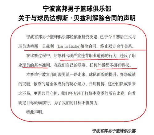 宁波队方面表示,外援贝兹利,出现严重违背职业道德的行为,因此,正式解除双方的合同。与此同时,宁波队还表示CBA联赛是征途国际 自己的联赛,任何一个外援,都是不拥有特权!