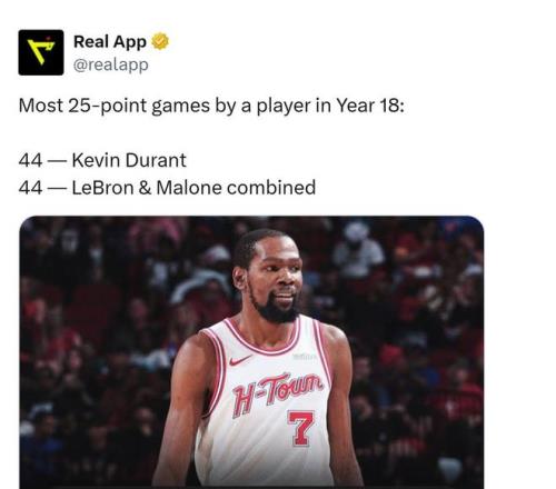 值得一提的是,杜兰特还创下了NBA历史第1的神迹。杜兰特在生涯第18个赛季已经44次砍下25+,这一数据排名NBA历史第一,等于第二的勒布朗詹姆斯(24次)和第三的卡尔马龙(20次)相加之和。