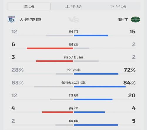 赛后技术统计呈现出一种极其吊诡的画面:浙江队在传球成功率(84% vs 63%)、角球数(5 vs 2)、射门数(15 vs 12)上全面占优,但射正数却以2-6惨淡收场。