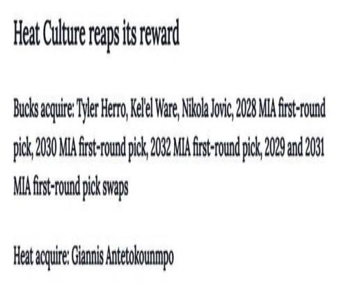 雄鹿得到:希罗+凯尔韦尔+约维奇+28年热火首轮+30年热火首轮+32年热火首轮+29、31年热火首轮互换;