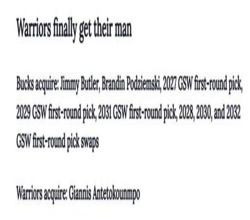 雄鹿得到:巴特勒+波杰+27年勇士首轮+29年勇士首轮+31年勇士首轮+28、30和32年勇士首轮互换;