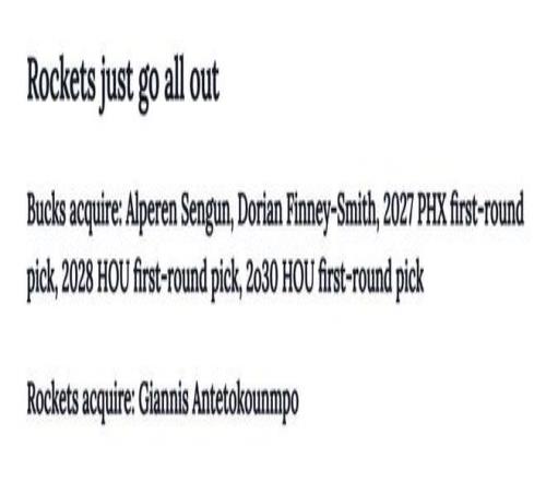 雄鹿得到:申京+芬尼史史密斯+27年太阳首轮+28年火箭首轮+30年火箭首轮。